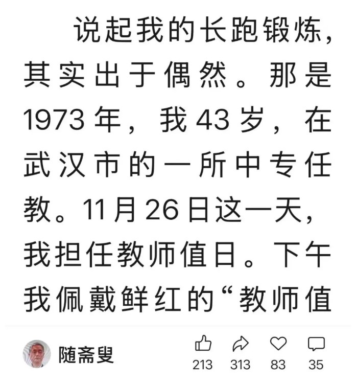 从42年长跑,到适时改为步行,他始终坚持从实际出发,顺应身体、量力而行,并持之以恒。他曾在一首五绝中写道:“生命在于动,但须恒久功。川流而不息,自是傲霜松。” 正如他在《我的42年长跑生涯》一文结尾时引用一位哲者的名言:人生最大的成功,就是健康地活着。 张老先生用他的42年长跑生涯,朴素而有力地诠释了这一至理名言。